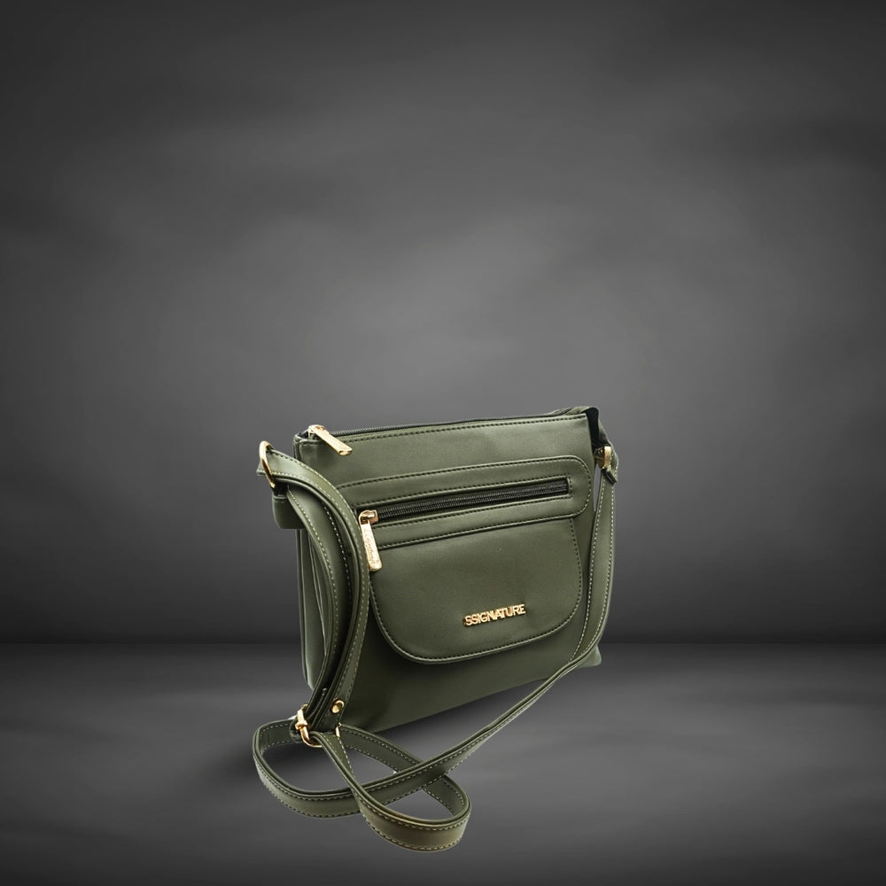 Design: Modern, minimalist aesthetic in a chic olive green shade, featuring gold-toned zippers and a signature logo detail.
