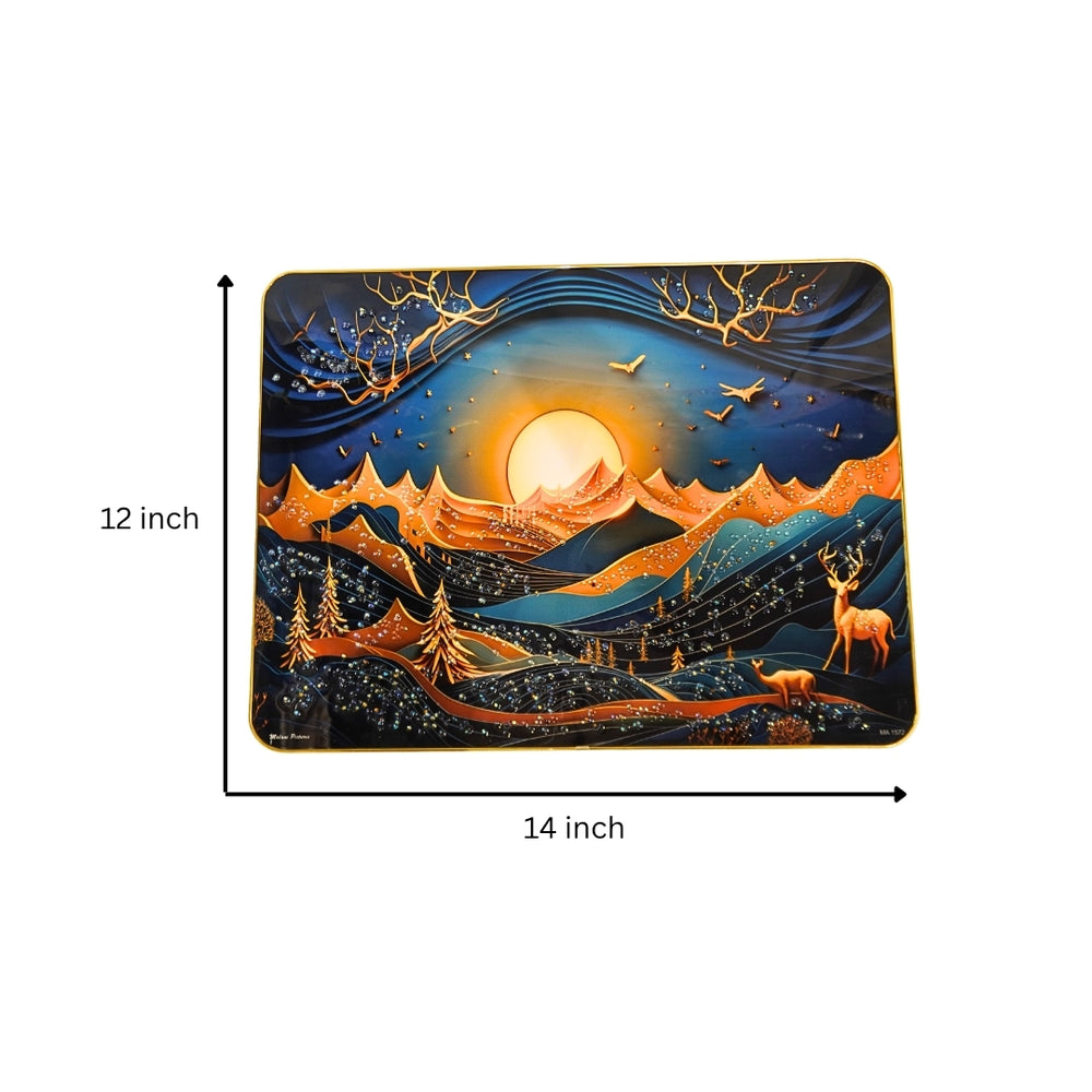 Bring the serenity and drama of a mountain twilight into your home with this stunning decorative piece. This tray, a true work of art, captures a majestic landscape where the golden glow of the sun meets the deep indigo of the night sky.