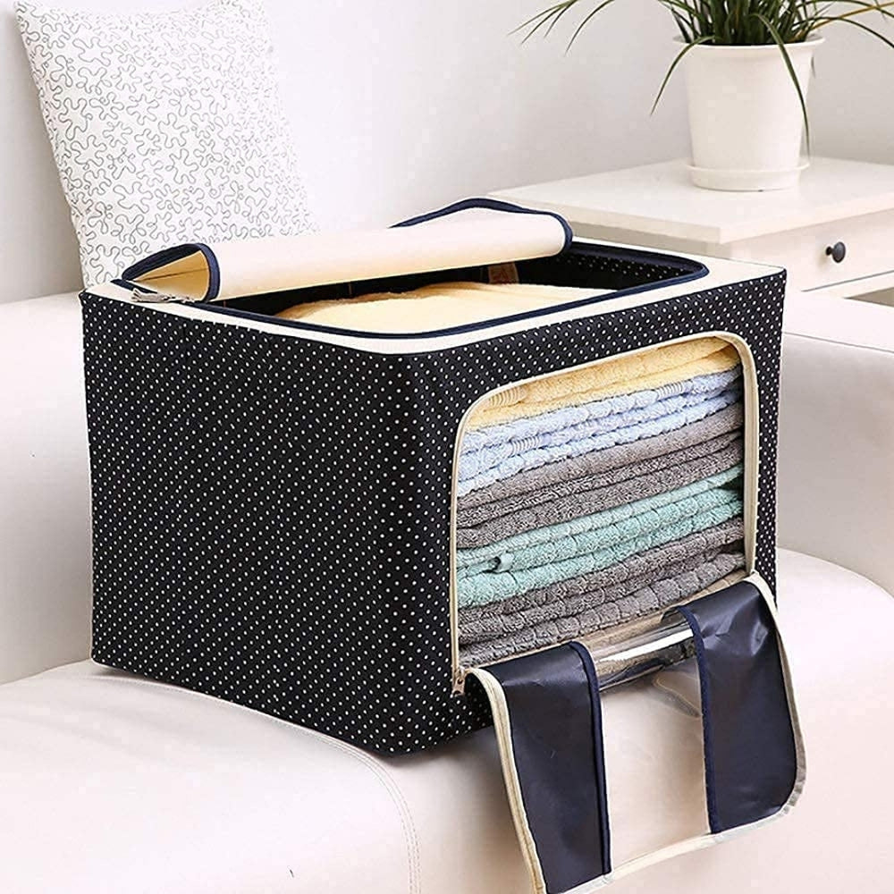 Maximize your closet and home space with this stylish and functional storage solution. This box features a charming navy blue and white polka dot pattern made from durable 600 D Oxford Fabric. The secret to its stability is the internal steel frame which provides superior stability and stack-ability, allowing you to safely store multiple boxes vertically.